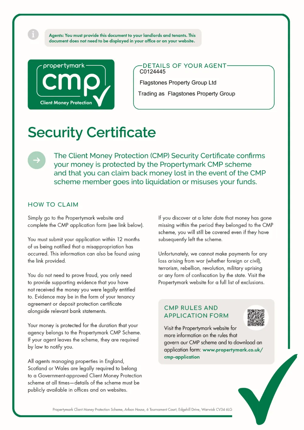 Flagstones Property Group Ltd is a certified member of the Client Money Protection (CMP) scheme, issued by Propertymark, ensuring complete transparency and safety of all client funds. These certificates verify that our company fully complies with Propertymark’s professional and financial standards. This means your money is handled responsibly and securely at all times. Our CMP membership demonstrates our commitment to maintaining trust, accountability, and ethical conduct in every property transaction. Company Number: C0124445, valid until 30 September 2026.
